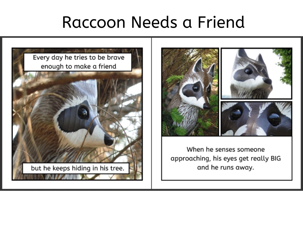 Shy little raccoon tries to be brave. He really wants to make a friend, but he keeps hiding in his tree. Then one day he is caught off guard! Will raccoon be able to find his self-confidence and make a friend?